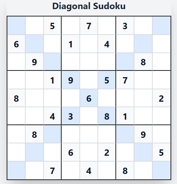 Diagonal Sudoku follows the same core logic as classic Sudoku: fill a 9×9 grid so that each row, column, and 3×3 subgrid contains the digits 1–9 exactly once. But here’s the game-changer — both the main diagonal (top-left to bottom-right) and the anti-diagonal (top-right to bottom-left) must also contain 1–9 without duplicates.