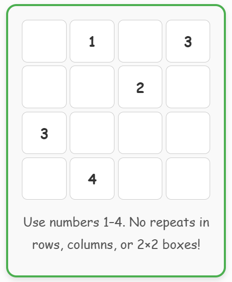Mini Sudoku for kids is a bite-sized 4×4 or 6×6 logic puzzle that swaps the intimidating 9×9 grid for quick, confidence-building wins. Using just numbers 1–4 (or colors for pre-readers), it teaches pattern spotting, focus, and gentle problem-solving in 5–10 minutes. Perfect for ages 4–9, it’s a screen-free brain booster that turns “I can’t” into “I did it!” — no apps, no ads, just pencil, paper, and growing minds.